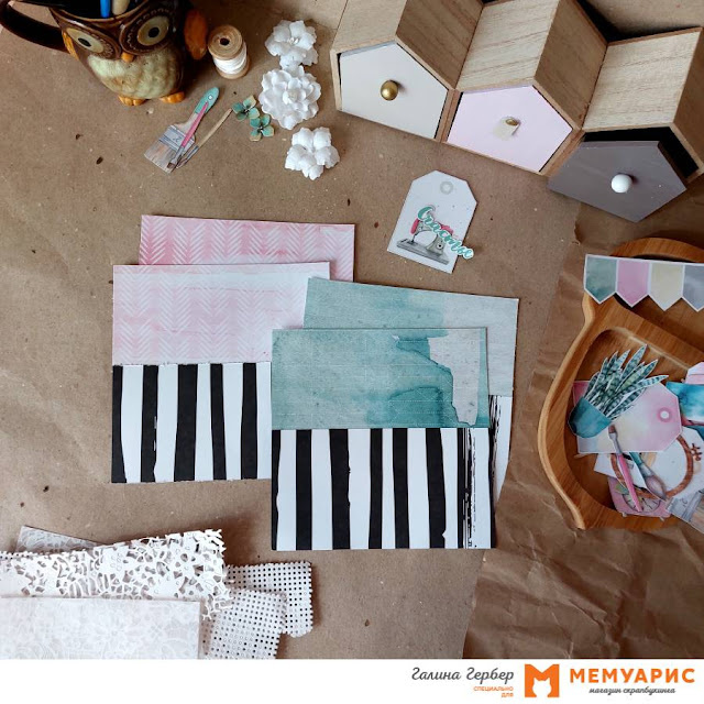 С вами Галя Гербер и сегодня я покажу свой старенький, самый первый мастер-класс по созданию полосатых открыток. Открытки я всегда делаю парами или тройками. Так более рационально расходуется бумага и декор. В деле раритетные уже коллекции APRIL paper Proчувства и Cozy Home. Размеры заготовок 15 х15 см. Для каждой открытки я приготовила полоски кальки и вырубки. Кальку я обрезала по ширине заготовки, а вырубку сделала чуть длиннее. В работе я использовала ножики Mimicut "Научитесь вышивать" и "Всё в ажуре". Теперь время моей верной помощницы - швейной машинки. Делаю строчку по краю с отступом 3-4 мм. Вырубку я пришиваю только с одной стороны. Так поступаю со всеми заготовками. После того как края прошиты, присбориваю вырубку и делаю строчку по центру. Получились рюши, только бумажные. Теперь машинку можно убрать на место. Я ленюсь завязывать узелки и пользуюсь двустронним скотчем для того, чтобы закрепить нитки с обратной стороны. Обязательно прохожусь палочкой для биговки по шву. У ме