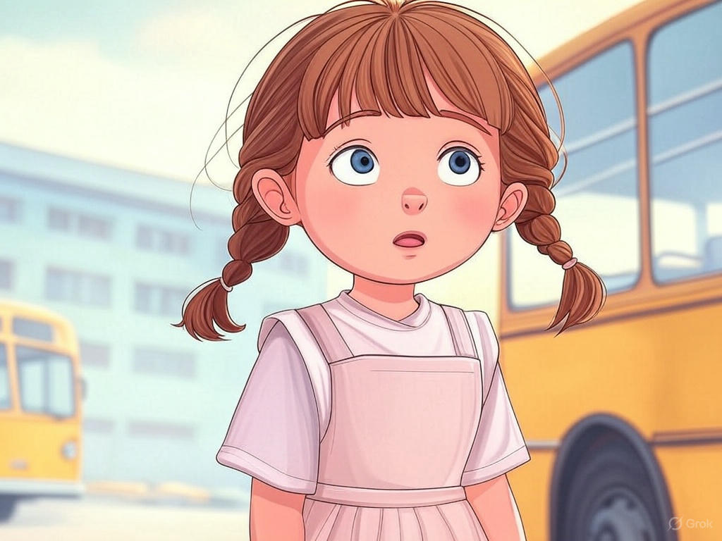 Однажды солнечным субботним утром Маша-Растеряша собиралась на рисование. В любимый рюкзачок она положила зайца Ваську, цветные карандаши, альбом и большое красное яблоко. Мама проводила её до остановки и сказала: — Маша, тебе нужен автобус номер 5. Он довезёт тебя прямо до кружка. Смотри внимательно на номер, поняла? — Конечно, мам! Номер 5, я запомнила! — весело ответила Маша, подпрыгнула на месте и помахала рукой. На остановке было шумно: автобусы подъезжали и уезжали, двери с шипением открывались и закрывались, а люди торопливо шагали в разные стороны. Маша села на скамейку и стала ждать. Вдруг к остановке подкатил большой жёлтый автобус с табличкой «55». — Так, кажется, тут написано пять! Значит, мой! — обрадовалась Маша и, не долго думая, и весело запрыгнула внутрь. Автобус тронулся. Сначала за окном мелькали знакомые дома, потом парк с зелёными качелями, а потом… всё стало каким-то незнакомым. Серые гаражи, высокий железный забор и огромная площадка с автобусами. — Странно… — пр
