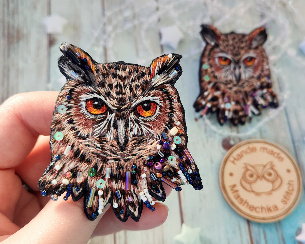 Филины, вышитые гладью, превращенные в брошки