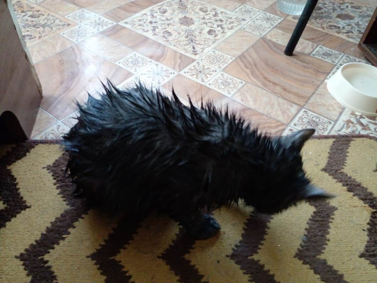 В первый же день нашего знакомства для Дариса были куплены тазик для купания и кошачий шампунь. Днем кот был вымыт. Вероятно, он впервые вообще сталкивался с подобным занятием. Поэтому купание прошло спокойно. Поставила его в тазик, тихонько полила на него теплой водой из леечки. Потом протерла салфеточкой, смоченной в кошачьем шампуне. Процедуру закончили теплой водичкой из леечки. Как только его завернули в полотенце, котенка "выключили совсем": ни на что не реагирующая "тряпочка". Покормленный и помытый, он проспал часа четыре. В интернете посмотрела, что котов не надо часто мыть. По этому решила делать это раз в месяц. Следующая процедура проходила чуть более нервно. Кот явно не собирался мочить шерсть. Ворчал, слабо пытался вылезти из тазика. Когда же понял мою решимость, "сдался", хоть и продолжал ворчать. А после полотенца и фена "Его помытое высочество" уже спал "без задних лап". Перед посещение врача надо было помыть кота. Но это оказалось сложным занятием. Кот плакал, старал