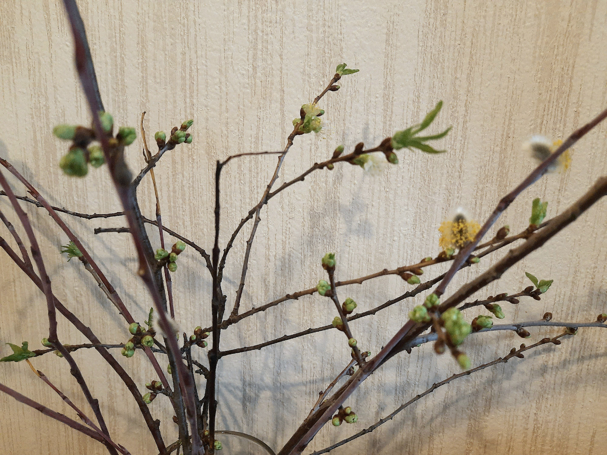 - Пока я искала возможность сделать зарисовку цветущих веточек в нашем букете,он завял.Дочь с бабушкой наломали вербы и каких-то непонятных веточек.Они уже дали корешки и зацвели.Похоже это вишня.