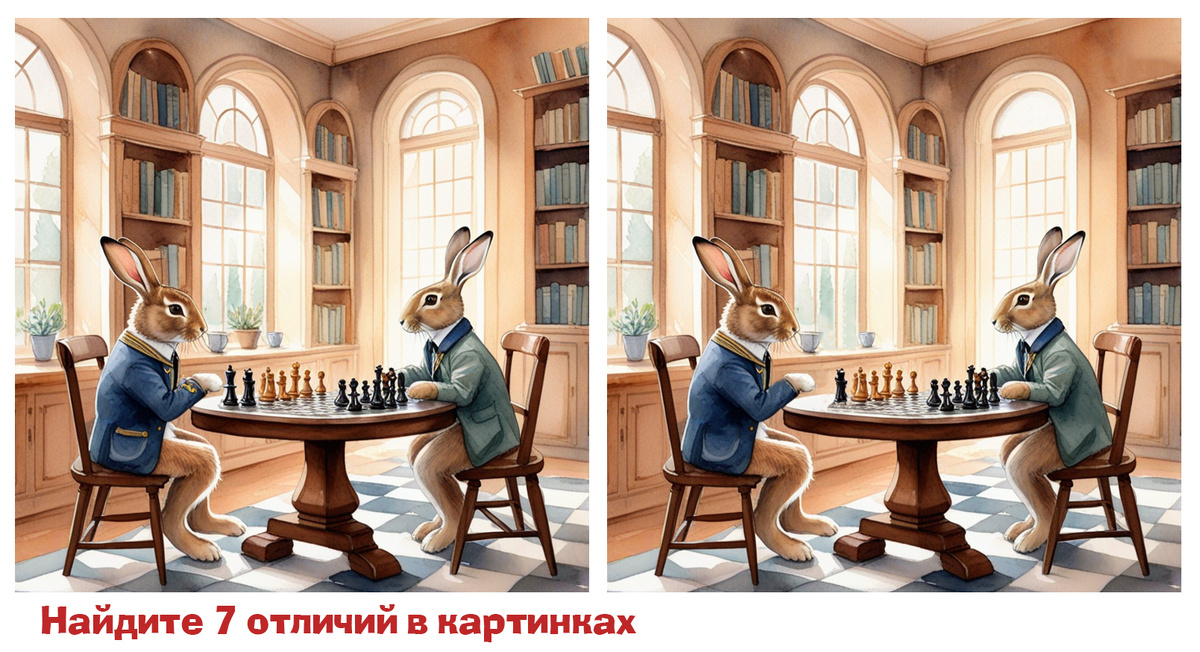 Как говорят гроссмейстеры: "Хорошая партия — это не только стратегия, но и умение не пропустить лишнюю пешку." Два уважаемых джентльмена — уши навострены, взгляды сосредоточены. В тихом кабинете решается судьба королевского гамбита. Всё идёт строго по правилам, но что-то не так… То ли фигуры поменялись местами, то ли пуговицы не сходятся в количестве? Найди 7 отличий и помоги шахматистам завершить партию достойно. Горизонтальная картинка: Вертикальная картинка: Какой глазомер! Ни одна деталь не ускользнула. Теперь партия снова идёт, как надо. Пусть вечер будет уютным, а чай — горячим.