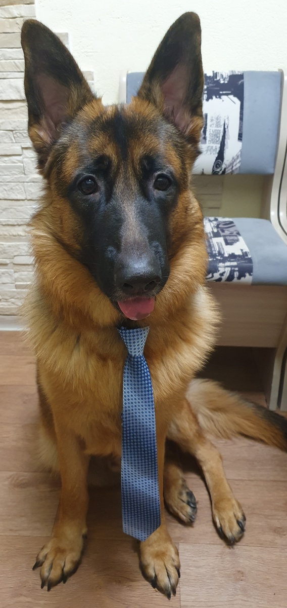 Галстук одолжили у сына) Сам Рекс еще не такой крупный, каким он стал сейчас. Все таки за этот год Рекс набрал хорошую форму. Взгляд ещё детский, наивный.