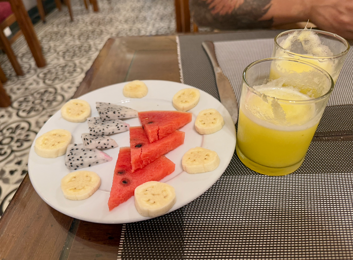 Первым делом нам принесли фрукты и два стакана свежевыжатого ананасового сока (не по меню). Подача фруктов улыбнула