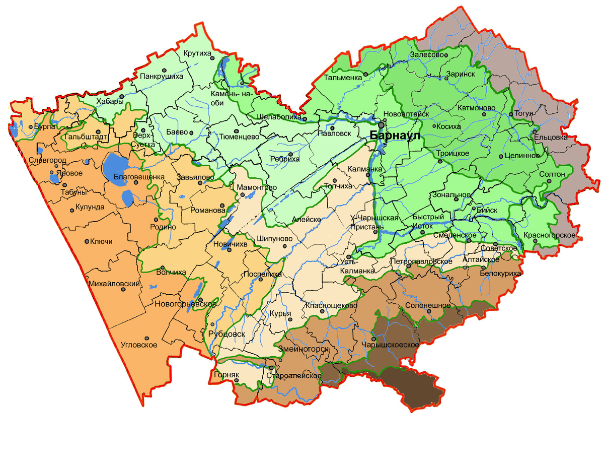 Алтайский край находится в степной и лесостепной природных зонах, но особенности их распределения и выделение подзон – итог экранирующего влияния Салаира и Алтая. В предгорьях Алтая общую широтную параллельность зон и подзон нарушает высотная поясность, что усиливает разнообразие местных климатов. Подзоны вытянуты с севера на юг, поэтому их южные части по сумме активных температур теплее северных на 100-200°, безморозный период длиннее на 10-17 дней. Степная и лесостепная природная зона разделяются на подзоны: степная – на сухостепную, засушливо-степную и умеренно-засушливо-степную, лесостепная – на южно-лесостепную, средне-лесостепную и северо-лесостепную. Зональные природные условия сказываются на ассортименте растений, технологии посадки, системе содержания насаждений. Многие муниципальные районы находятся в пределах двух и даже трех природных зон или высотных поясов.