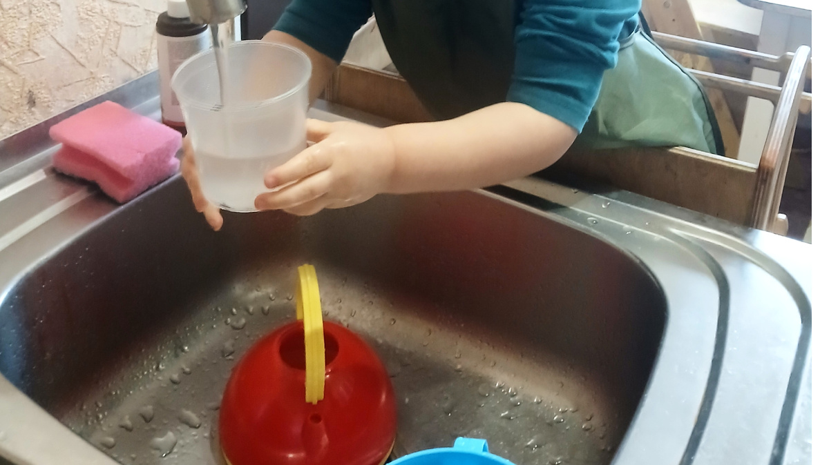 Внимание: каким бы экологичным ни было ваше средство для посуды, давать его ребёнку не следует. Если очень хотите сделать пену, лучше возьмите каплю детского мыла.