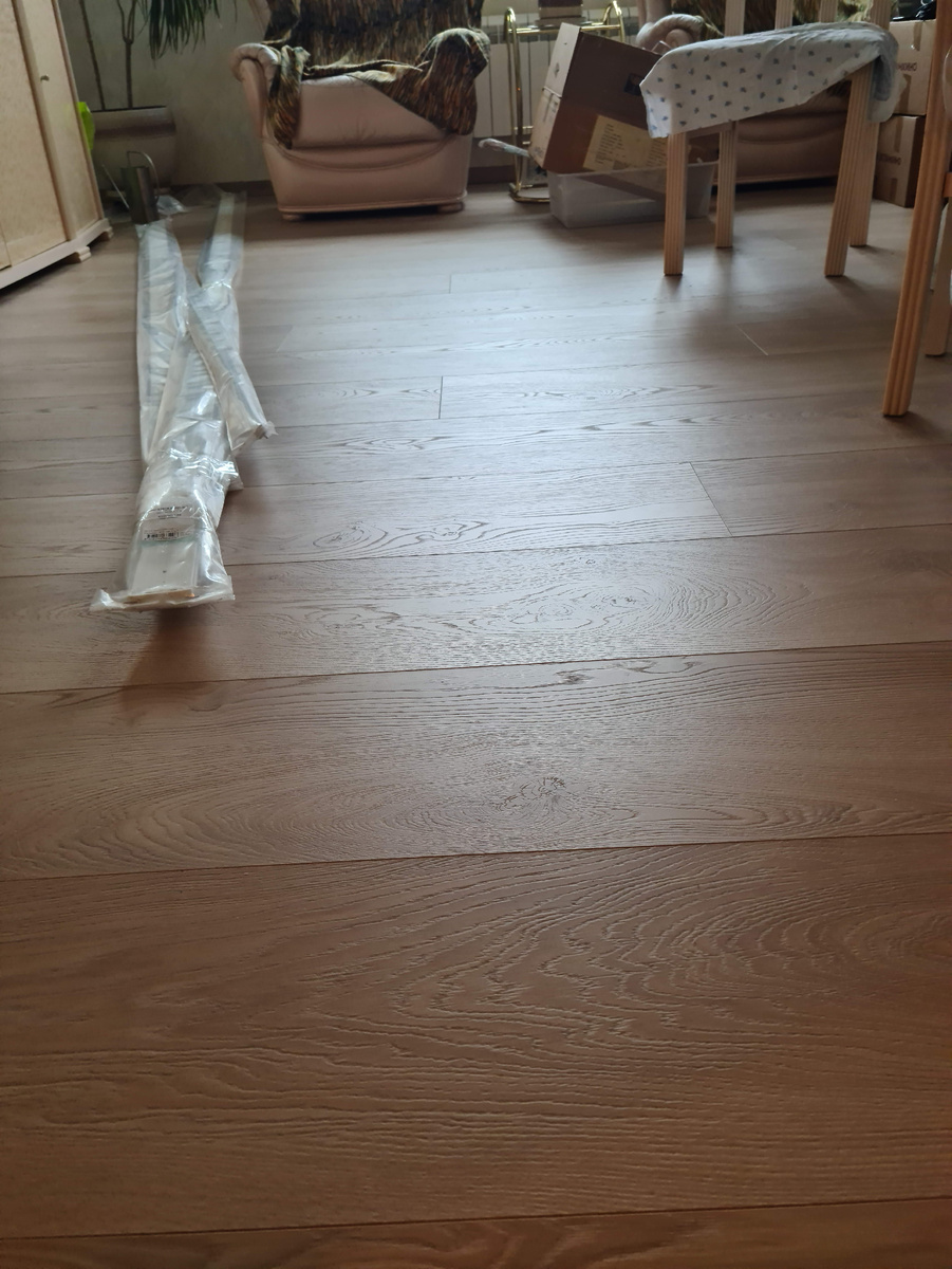 Нам написал Валерий З. из Ногинска: После укладки ламинат некоторое время лежал нормально, а потом мы стали замечать, что он прогибается на проходе - наверное, подложка истончилась. Хотим снять порог и подсунуть под ламинат кусок картона. Отвечаем Нет, не стоит этого делать! Ламинат стал прогибаться, потому что набух и "вышел из берегов". Подкладывание под него картона только ухудшит ситуацию: ведь картон очень гигроскопичен, он наберет воду и начнет ею делиться с ламинатом. а) Сырой стяжки. Об этом мы писали здесь. б) Отсутствия зазоров. Была оттепель, Вы наверняка открывали окна, повысив тем самым влажность воздуха в квартире. Ламинат впитал влагу из воздуха и увеличился в объеме. Если технологических зазоров действительно не было, уложенное полотно начало подниматься там, где это позволяет отсутствие мебели. В таком случае нужно срочно нарезать зазоры вдоль стен, потому что дальше будет хуже - ведь влажность будет расти. в) Попадания воды на срезы в районе порогов. Если срезы не з
