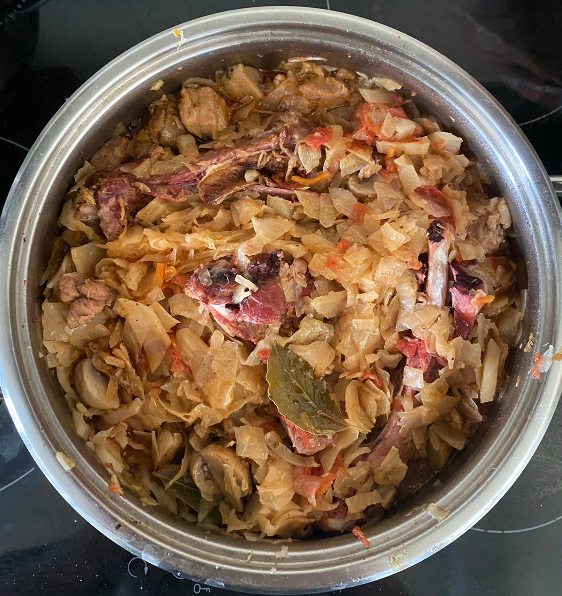 Это не классический польский бигус, но я его готовлю не первый раз и нам он нравится. Время приготовления 1,5-2 часа. Продукты которые понадобятся: 1. Капуста свежая-1200 гр. 2. Капуста квашеная- 400 гр. Мы покупаем в Магните в ведерках как на фото. соотношение свежей и квашеной капусты 3 к 1. 3.Одна большая луковица. 4. Помидор (можно использовать томатную пасту, но мы пастой не пользуемся) 5. Гуляш свиной-400 гр. 6. Ребра свиные копченые 250-300 гр. 7. Грибы-400 гр. (дело вкуса каждого, мне нравятся шампиньоны) 8. Приправы по вкусу. 9. Соль. 10. Растительное масло для обжаривания приблизительно 5 столовых ложек. Все ингредиенты подготовлены, начинаем готовить бигус: 1.В кастрюлю с толстым дом помещаем квашеную и нашинкованную капусту, добавляем порезанный помидор, ставим на средний нагрев и тушим 30 мин. Воду можно не добавлять, так как в квашеной капусте рассола достаточно. 2.Разогреваем сковороду, добавляем растительное масло и обжариваем мясо до корочки, но не до розово цвета, ко