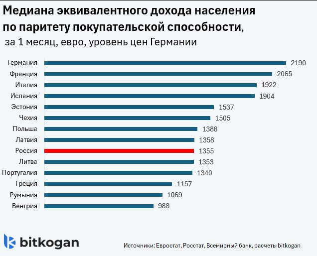 На выходных мы разбирали медианные доходы в России и Европе, и многие из вас спрашивали: а что с ценами? Ведь важно не просто сколько зарабатываешь, а сколько на эти деньги можно купить. ◽️Поэтому мы пересчитали доходы по паритету покупательской способности (ППС) — это когда все доходы приводят к единому уровню цен (на нашем графике — Германии). Если у нас цены ниже, то и доходы, грубо говоря, «умножаются» на эту разницу. ➡️ Результат? В таком пересчёте Россия выглядит лучше: по покупательной способности мы на уровне Польши и стран Балтии. Но разница с Западной Европой всё равно чувствуется: например, на средний доход в Германии можно позволить себе примерно на 60% больше товаров и услуг, чем у нас. Какой показатель лучше? Как и с ВВП, важно смотреть на оба показателя. Доходы по ППС лучше отражают уровень жизни в своей стране, а номинальные — возможности населения, особенно при путешествиях по миру. К примеру, если вы хотите купить квартиру в Дубае, никто не скажет: «А, у вас в России