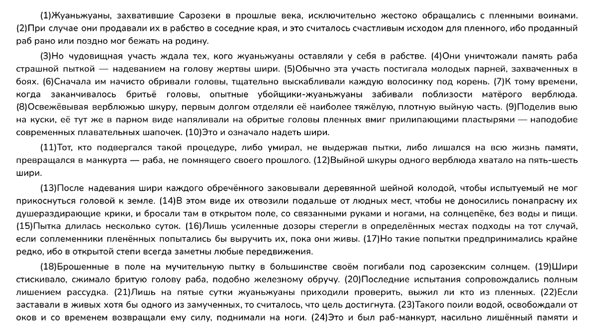 Сочинение по тексту варианта 951 ЕГКР 17.12.24 «Жуаньжуаны, захватившие Сарозеки в прошлые века, исключительно жестоко обращались с пленными воинами...» В чём значимость памяти для человека? Именно этот вопрос возникает после прочтения текста Ч.Т. Айтматова. По мнению автора, память — это суть человека, которая пребывает с ним «до последнего вздоха, оставаясь его единственным обретением, уходящим вместе с ним и недоступным для других». Лишаясь её, люди перестают быть собой. Чтобы доказать свою мысль, писатель говорит о чудовищных пытках, в результате которых пленник жуаньжуанов переставал «осознавать себя человеческим существом» и превращался в раба-манкурта. Автор отмечает, что манкурт был равнозначен «бессловесной твари», абсолютно покорен и безопасен, поскольку он не помышлял о бегстве и был готов «делать наиболее грязную, тяжкую работу». Можно сделать вывод: лишив человека воспоминаний и способности мыслить, жуаньжуаны превращали его в идеального раба, у которого отсутствовали воля