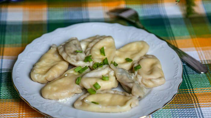 для теста: для начинки: Шаг 1/4 Приготовить тесто для вареников. Для этого просеять в миску муку с солью, добавить яйцо, постепенно влить воду комнатной температуры и вымесить эластичное тесто. Обернуть тесто для вареников пищевой пленкой и убрать в холодильник на полчаса. После этого тесто будет более мягким. Для начинки протереть шляпки грибов и, если надо, очистить основание грибных ножек. Грибы мелко порезать. В сковороде разогреть растительное масло и пассеровать на нем мелко рубленый лук. Добавить к пассерованному луку белые грибы и обжаривать все вместе до готовности грибов. Посолить по вкусу и снять с плиты. Шаг 2/4 Приготовить картофельное пюре. Картофель очистить, положить в кипящую подсоленную воду и варить до готовности. Вареный картофель размять, добавить сливочное масло и немного молока. Смешать картофельное пюре с жареными грибами. Начинка для вареников готова. Шаг 3/4 Дальше можно лепить вареники двумя способами. Первый - безотходный, но требует больше времени. Тес