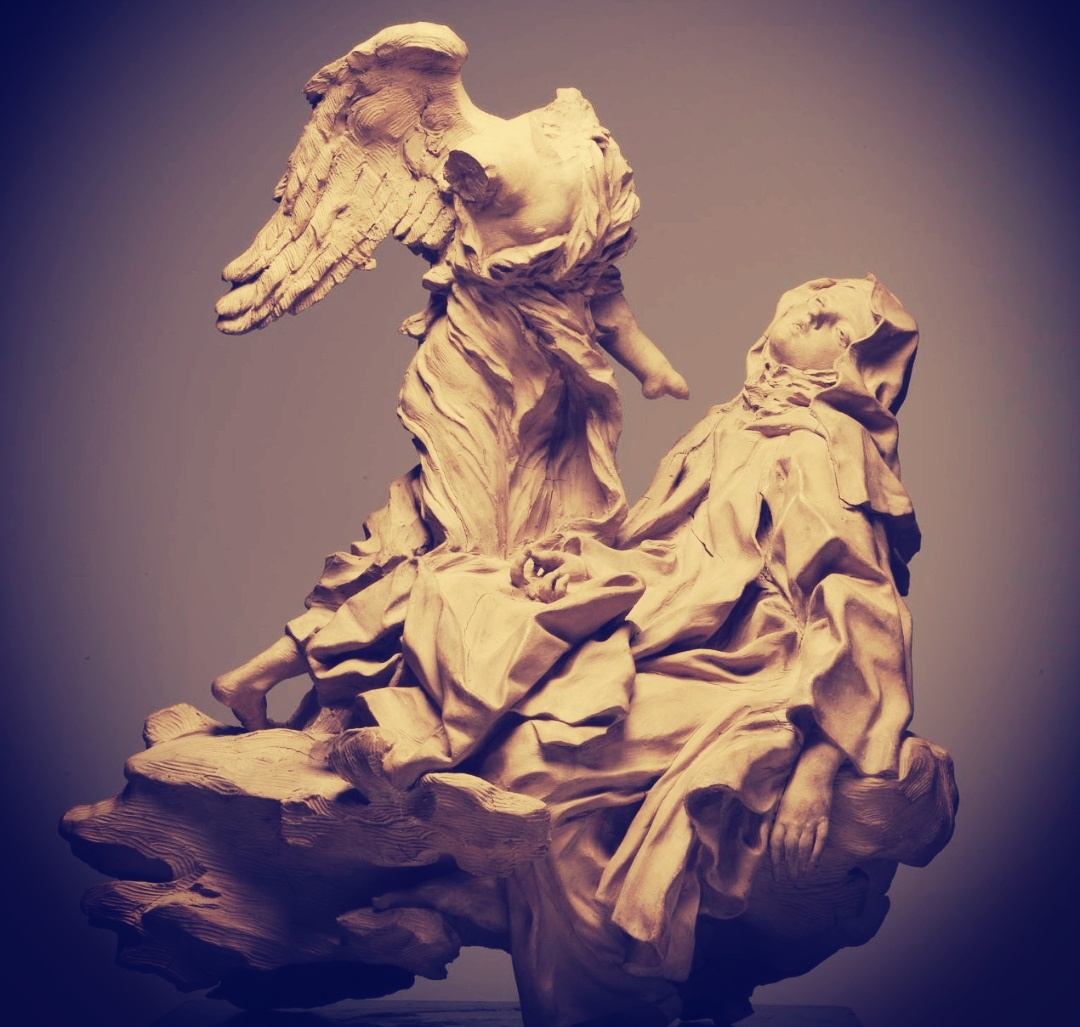 Мы в Эрмитаже, в зале № 237, и стоим рядом с “Лютнистом” Караваджо с его аллегорией пяти чувств, но мы смотрим на другой объект культурного наследия, с обычными чувствами связанный слабо. Здесь мы явно имеем дело с изменённым состоянием сознания. Красивая молодая женщина с лицом опрокинутым, вне зоны комфорта, за границей контроля. Её истома длится, терракотовый стон практически слышен. Она - испанская монахиня Тереза Авильская. Рядом с ней – фигура ангела. Состояние этой статуэтки не позволяет увидеть, чем он занят, но мы знаем об этом из жизнеописания св. Терезы. Впрочем, об этом чуть позже. Финальный, неповреждённый шедевр стоит в римской церкви Санта-Мария-делла-Виттория. Эрмитажный Макет испещрён трещинами, ограблен сколами. Тем не менее, эти недостатки данного экземпляра вторят терезиной молитве: “… не забывай так скоро великих грехов моих, не проливай столь драгоценной влаги в треснувший сосуд”. Мы видим главное – мы видим её лицо. Лицо, в которым истома и боль неразрывно связаны между собой.