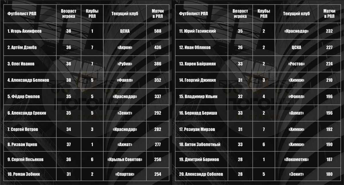Действующие лидеры РПЛ по сыгранным матчам.