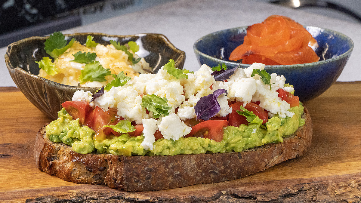 Утро - это время, когда хочется баловать себя и любимых чем-то вкусненьким. А что может быть лучше, чем начать день с вкусного и красивого завтрака? Предлагаем вам несколько классно - сочетаемых закусок для идеального начала дня. Первая вкусняшка у нас - это скрэмбл. Здесь всё просто: на сливочном масле и на небольшом огне жарим, постоянно перемешивая пару яиц. Готовый скрэмбл перекладываем на тарелку и украшаем зеленью. Вторая закуска на завтрак будет из красной рыбки - нарезаем тонкими слайсами ломтики форели, аккуратно сворачиваем в розочку и перекладываем на тарелку. Готово! Третьим дополнением королевского завтрака приготовим бутерброд с авокадо: половинку авокадо разминаем вилкой, по вкусу солим и выжимаем пару капель сока из небольшого кусочка лимона. Разделяем на маленькие кусочки адыгейский сыр и сбрызгиваем оливковым маслом. На ломтик хрустящего хлеба, обжаренного на сливочном масле выкладываем пасту из авокадо, посыпаем мелко нарезанными томатами и адыгейским сыром. Сверху