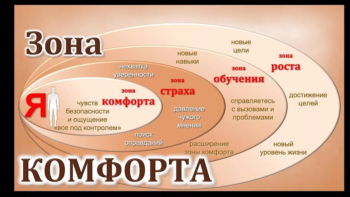 Вы наверное уже много раз слышали это изречение: "Выходите из зоны комфорта"? Какая то странная фраза. И многим до конца не понятно, зачем это делать и что это такое "Зона комфорта". В своей работе я редко транслирую эту фразу. Обычно, просто рекомендую внести в свою жизнь новизну. Но сегодня я решила пояснить, что это такое и зачем. Несколько советов, которые могут помочь вывести себя из зоны комфорта: * Бросить себе спортивный вызов. Новый для вас вид спорта, поможет выйти за привычные рамки и начать личностный рост. Если вы не посещали спортзал, начните это делать. Если нет возможности, просто ежедневно начните ходить пешком, больше и дальше обычного своего маршрута. Выход из зоны комфорта может быть как очень стремительным, так и тянуться годами. Важно учитывать свои базовые ресурсы: личностные, психические, биологические. Посмотрите на фото выше. Схема, очень понятно показывает, что даже незначительные изменения в вашем привычном образе жизни привнесут в нее больше позитивного и