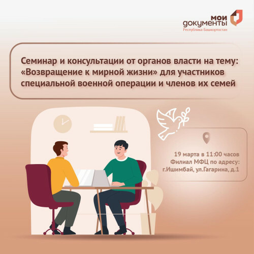 19 марта в МФЦ Ишимбая состоится семинар «Возвращение к мирной жизни» для участников специальной военной операции и членов их семей. В ходе мероприятия будут обсуждаться меры государственной поддержки и вопросы ведения предпринимательской деятельности. – В этом году у нас запланированы подобные семинары, встречи, круглые столы и консультации во всех офисах МФЦ Башкортостана. Участники смогут получить важную информацию о доступных возможностях для развития бизнеса, а также о других формах помощи и поддержки, – отметила директор МФЦ Республики Башкортостан Наталья Куприянова. В мероприятии примут участие бизнес-шериф, представители ФНС, Управления пенсионного фонда, Центра занятости населения, центра «Мой бизнес», Военного комиссариата, ЦРБ, Государственного фонда поддержки участников СВО («Защитники Отечества»), Росреестра, Управления образования и бизнес-сообщества. Место проведения: Ишимбай, ул. Гагарина, д. 1 (филиал МФЦ). Время: 19 марта в 11 часов. Участие бесплатное.
