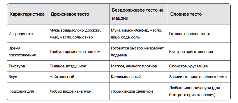 Хачапури – это грузинское блюдо, представляющее собой лепешку с сырной начинкой. Существует несколько видов хачапури, и для каждого из них используется свой вид теста. Вот несколько популярных рецептов теста для хачапури: Выбор теста для хачапури зависит от ваших предпочтений и наличия времени. Дрожжевое тесто требует больше времени на приготовление, но дает более пышный и воздушный результат. Бездрожжевое тесто на мацони готовится быстрее и проще, но хачапури получаются немного плотнее. Слоеное тесто позволяет быстро приготовить вкусные хачапури. Экспериментируйте с различными видами теста и начинок, чтобы найти свой идеальный рецепт хачапури!