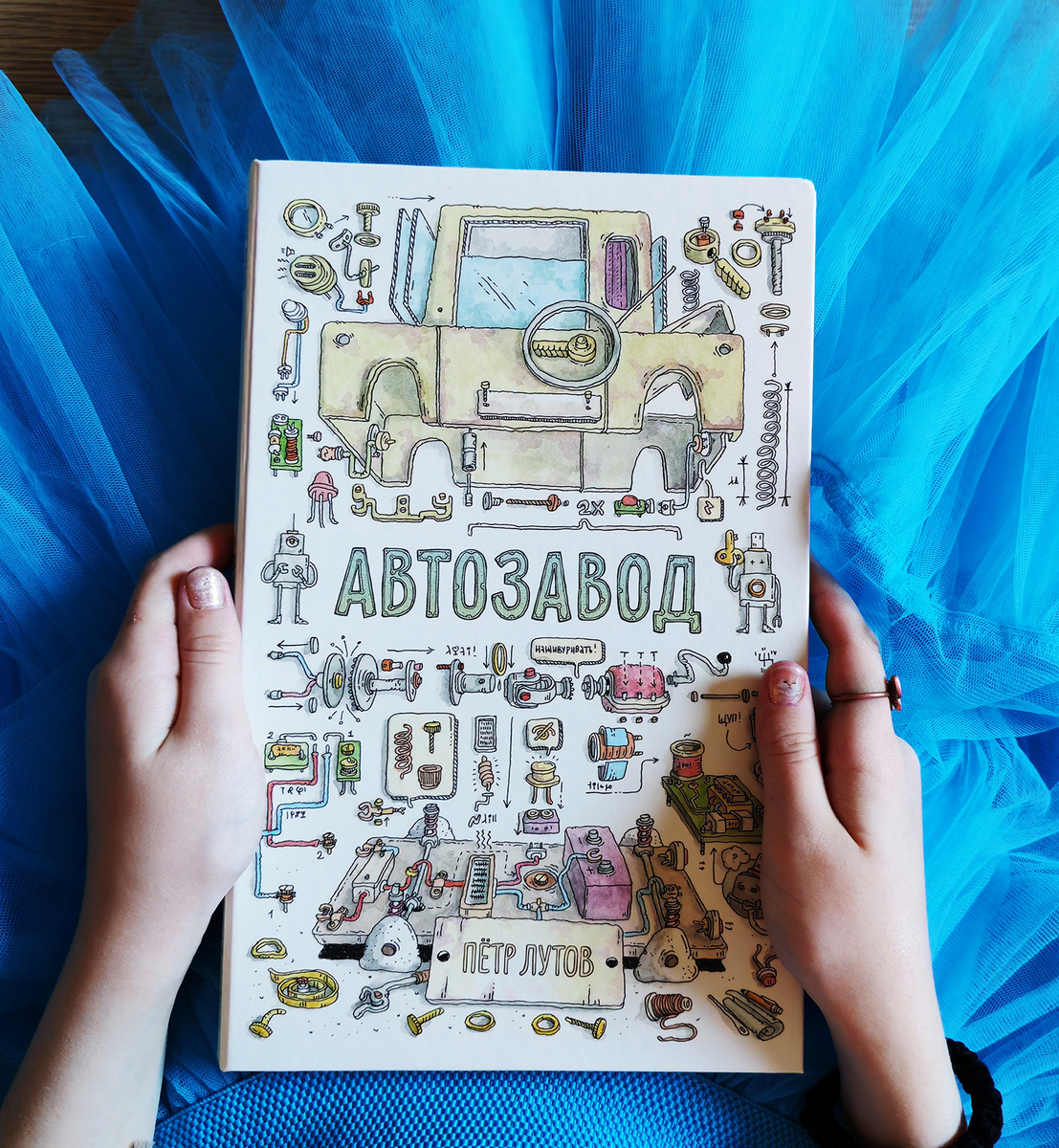 Когда моя девятилетняя дочь видит новые книги издательства «Поляндрия», она сразу кричит «хочу», уже не глядя, так они ей нравятся. Так у нас появилась книжка-раскладушка а-ля виммельбух Петра Лутова «Автозавод». Пётр Лутов не называет себя профессиональным иллюстратором, он ведущий дизайнер пользовательского опыта в разработке программного обеспечения в B2B секторе. А рисовать начал где-то в 2017 году, в том числе «на долгих совещаниях или размышляя, как решить ту или иную задачу». «Автозавод» — первая книга и, как я поняла, автор уже готовит две следующие: под рабочими названиями «Всё не так. О принципах работы и внутреннем устройстве бытовых приборов» и «Самодвижущиеся повозки». Как у многих книг «Поляндрии» невозможно определить возраст читателей. Для малышей это будет увлекательный виммельбух, который раскладывается длинной полосой в 4 метра (метраж я не проверяла). Вокруг можно долго ползать и рассматривать картинки. Дети по старше — дошкольник могут более предметно изучать детал