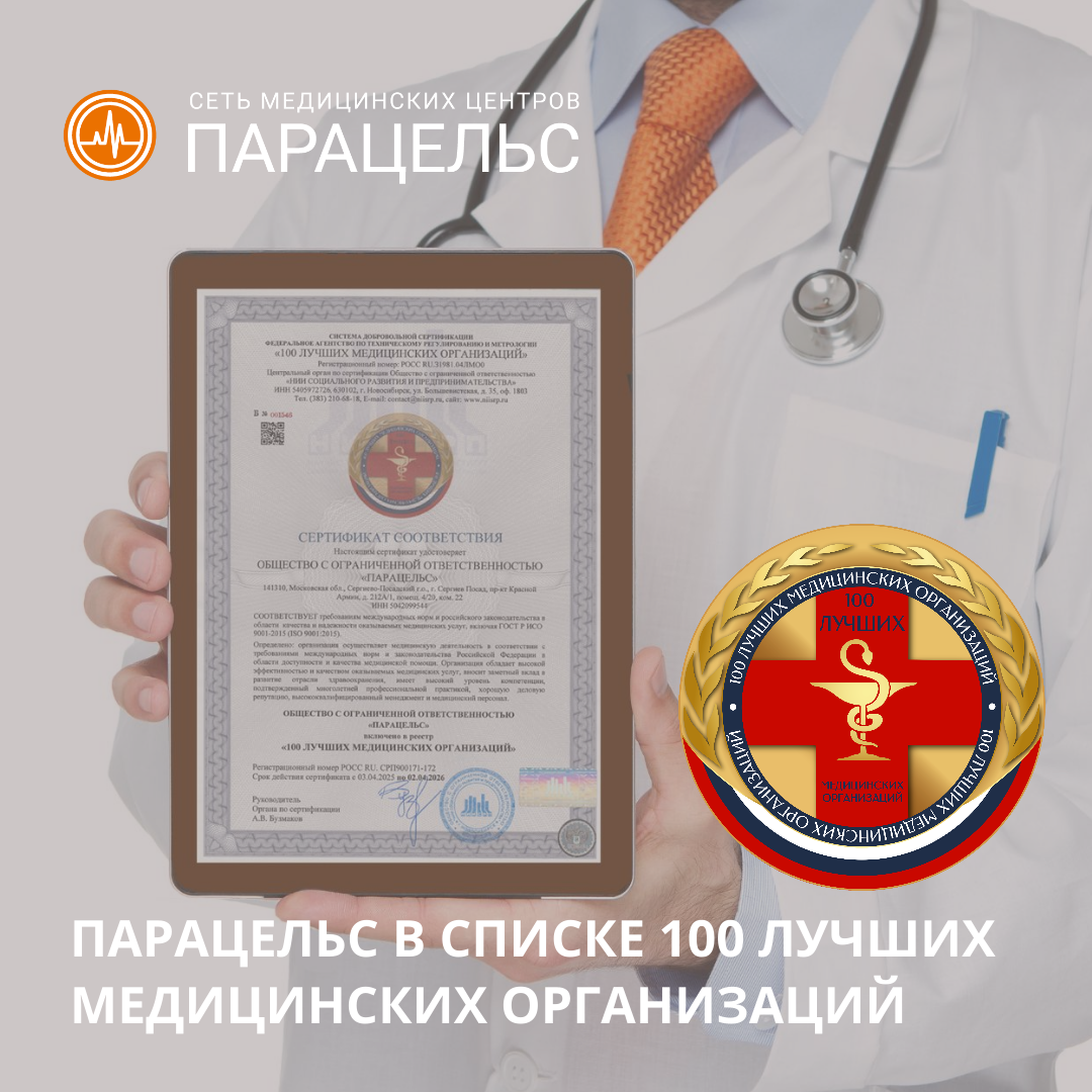 Делимся прекрасной новостью❗ 👉 Научно-исследовательский институт социального развития и предпринимательства совместно с Федеральным агентством по техническому регулированию и метрологии (Росстандарт) внесли Медицинский центр «Парацельс» в список «100 лучших медицинских организаций». ✅ Наша организация соответствует требованиям ГОСТ Р ИСО 9001-2015 (ISO 9001:2015). Это высокое признание нашего вклада в развитие отрасли здравоохранения и подтверждение того, что мы следуем международным нормам и российскому законодательству в области качества и надежности медицинских услуг. Мы хотим выразить благодарность всем нашим врачам и сотрудникам за самоотдачу, дружную команду и любовь к выбранному делу 👏 Также мы благодарны нашим пациентам за доверие и поддержку, которые вдохновляют нас на новые победы и достижения. Мы обещаем и дальше работать над повышением качества наших услуг и заботиться о вашем здоровье! 😉 💻 Вы можете самостоятельно записаться на прием к нашим врачам через личный кабинет
