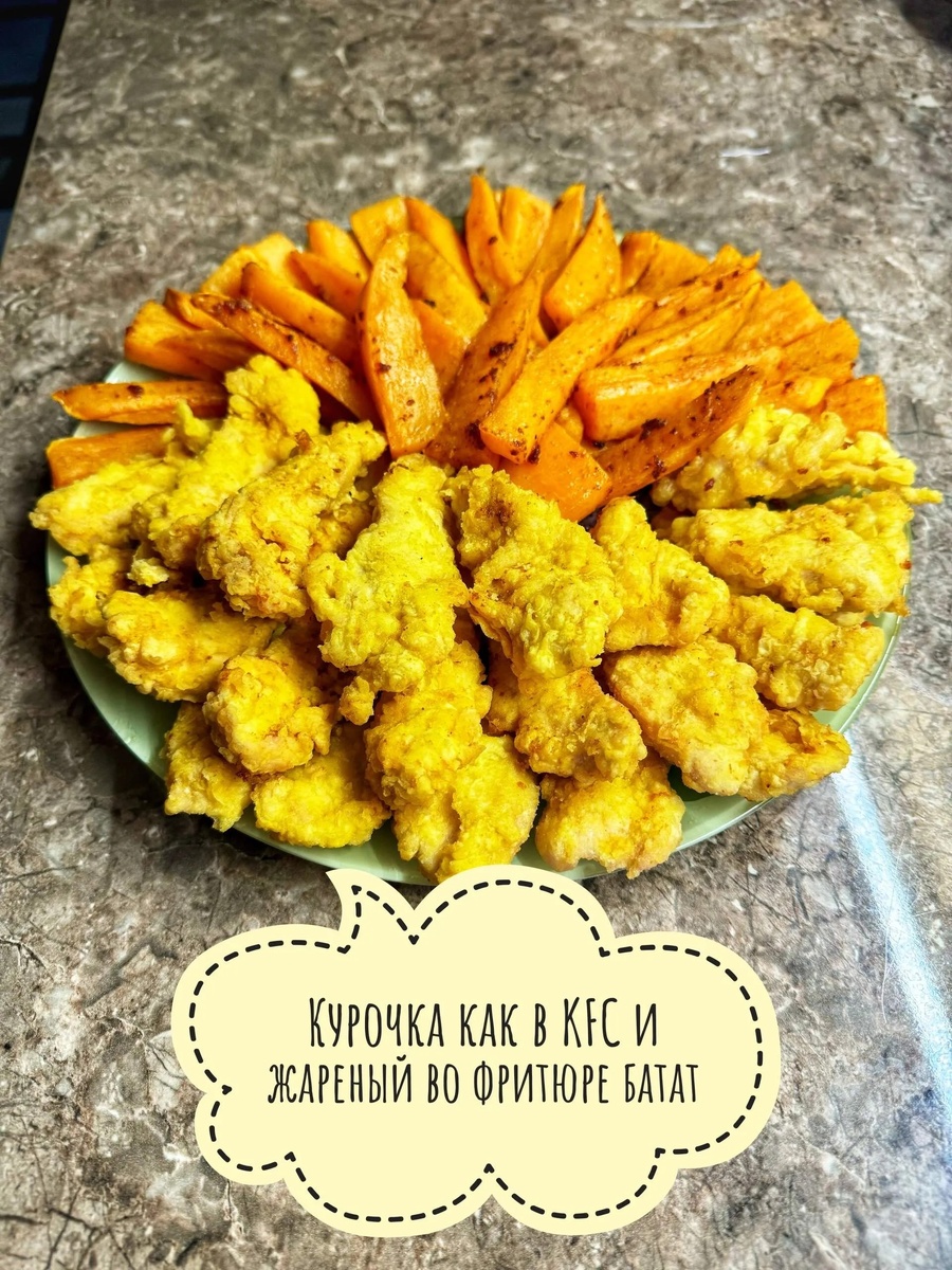 🌶️Остренькая курочка как в KFC и 🍠сладость батата. Идеально! 👩🏻🍳 Блюдо из знаменитой сети ресторанов на твоей кухне! Курица из KFC любима многими, и рецепт ее приготовления пытаются повторить все. По этому способу она получается наиболее близкой к оригиналу: панировка хрустящая и острая 🌶️, а начинка сочная! 👩🏻🍳Приготовление: 1. Филе куриное помойте и обсушите. Нарежьте на продолговатые кусочки. 2. В отдельной посуде подготовьте готовую панировочную смесь для острой курочки. В другой посуде вилкой взбейте яйцо с небольшим количеством соли. 3. Почистить батат и нарезать его крупными ломтиками. 4. Каждый кусочек курицы обильно обмакните в яичную смесь, затем хорошо запанируйте в специальной панировочной смеси. 5. В сковороде хорошо разогрейте масло для фритюра, выложите запанированные кусочки курицы и обжаривайте на небольшом огне по 5 минут с каждой стороны. Курица обязательно должна прожариться внутри. И должна быть немного румяной и хрустящей. Готовые кусочки курицы вылож