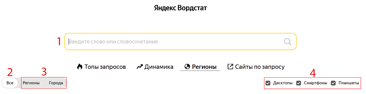 Рассмотрим основные элементы, с которых мы начнем работу в «Яндекс Wordstat»: