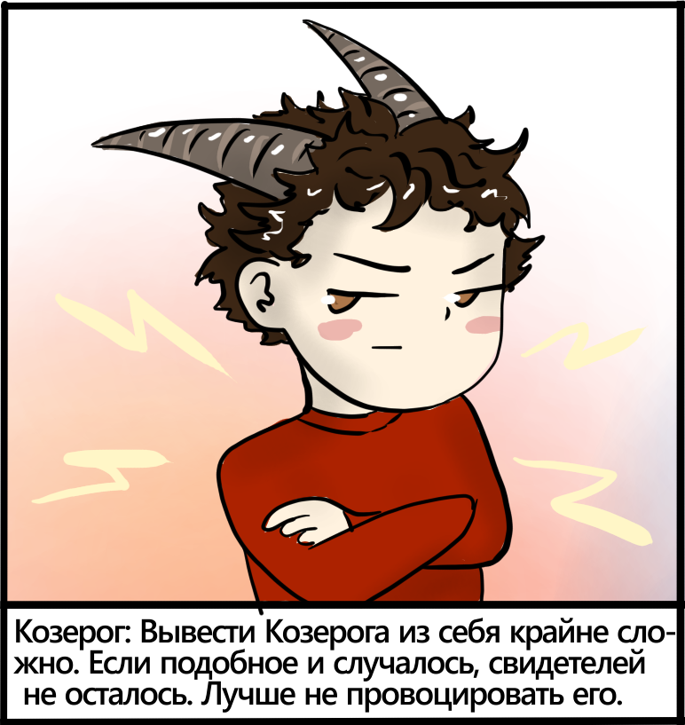 Вывести Козерога из себя крайне сложно. Если подобное и случалось, свидетелей не осталось. Лучше не провоцировать Козерогов, сами решат, когда действовать. Признаки надвигающейся бури: Козерог покусывает губы и роняет предметы. Вот и все. Проблема окружающих Водолея в его непредсказуемости. На грани он может оказаться по любому поводу. Обидевшись, Водолей спрячется и будет страдать. Возмутившись, произнесет гневную речь. В любом случае, это будет незабываемое зрелище. Среди Рыб есть и инквизиторы. Если Рыбы говорят "Ты не прав!", бегите. Обычно они не спорят, значит, дело серьезно. Легко понять, когда Овна лучше не трогать: он кричит и стучит. Но это лишь когда он чувствует поражение в споре. Настоящий предел – тишина и угрюмость. Вот тут не подходите. Телец, доведенный до предела, предупредит об опасности словами. Он заботится об окружающих и не хочет причинить вред случайно. Не доводите его до намеренного вреда. Если Близнецам плохо, плохо должно стать всем. Они придут и принес
