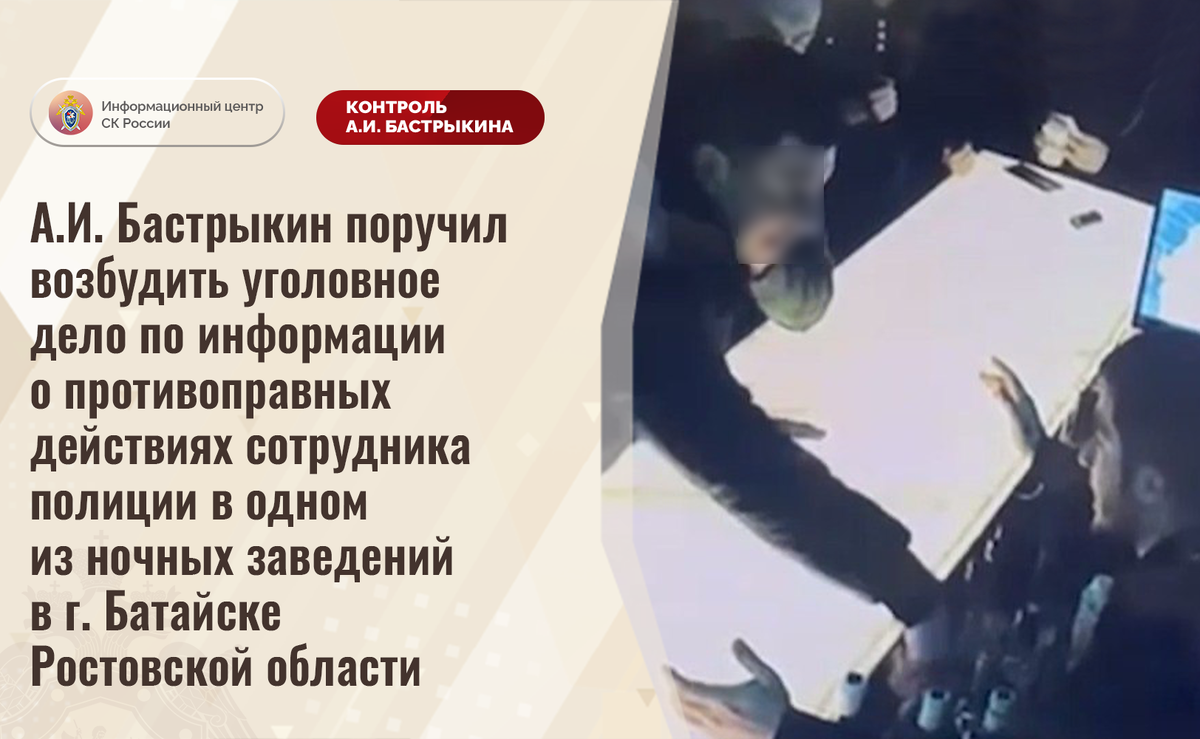 А.И. Бастрыкин поручил возбудить уголовное дело по информации о противоправных действиях сотрудника полиции в одном из ночных заведений в г. Батайске Ростовской области В телеграм-канале сообщается о совершении противоправных действий сотрудником органов внутренних дел в городе Батайске Ростовской области. В феврале текущего года в одном из ночных заведений мужчина, находясь в состоянии опьянения, нарушал общественный порядок и провоцировал конфликты с посетителями и персоналом, на замечания реагировал агрессивно. После обращения сотрудников клуба в правоохранительные органы в их адрес со стороны фигуранта и его знакомых стали поступать угрозы физической расправы, а также неустановленные лица проникли в помещение заведения и похитили оттуда крупную сумму денег. Ранее А.И. Бастрыкин поручал представить доклад по указанной ситуации. В СУ СК России по Ростовской области по данному факту проводится процессуальная проверка. Председатель Следственного комитета Российской Федерации Александр