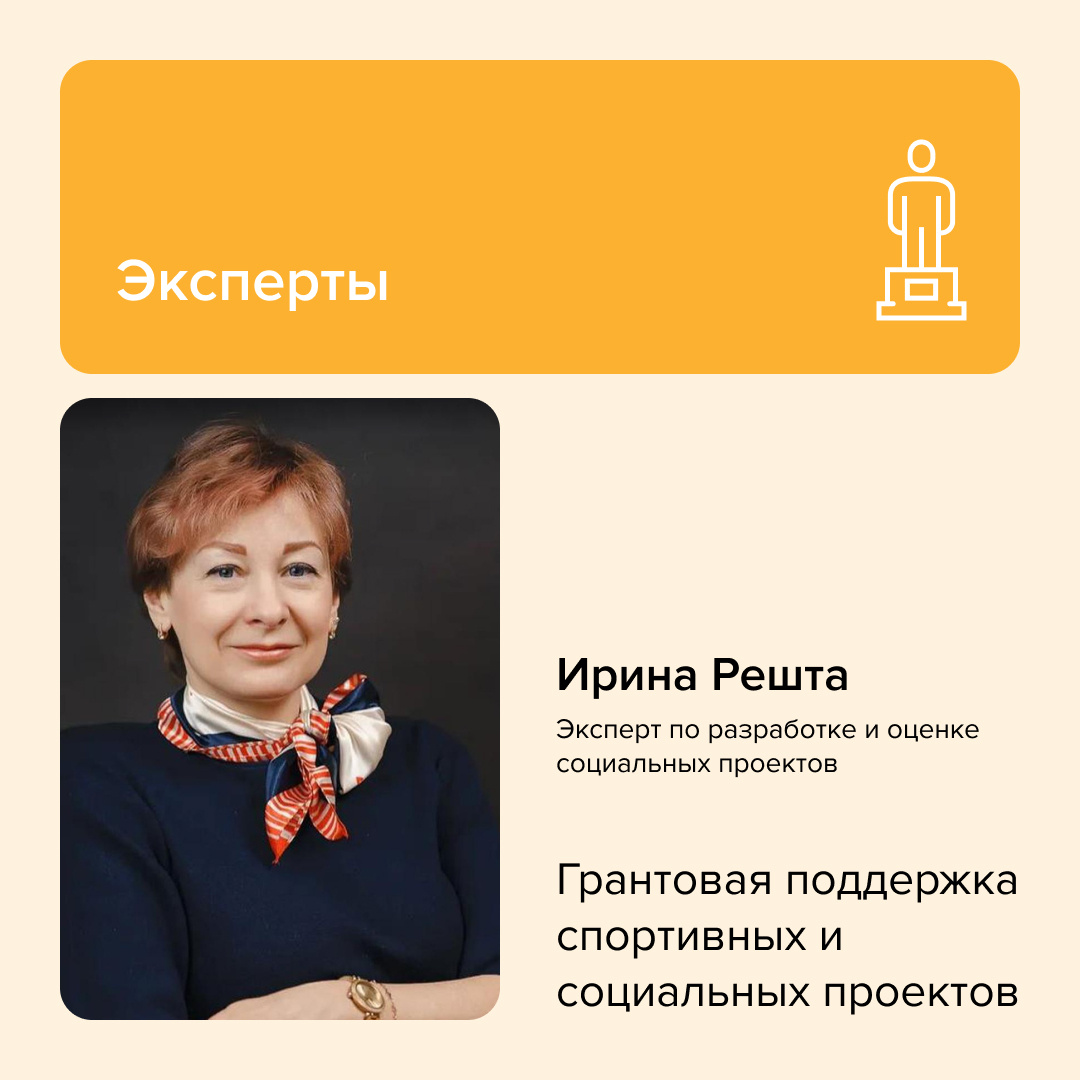 Знакомьтесь, Ирина Решта — эксперт, который знает, как превратить идею в реальный результат и сделать социальный проект жизнеспособным, полезными и логичным. Более 20 лет Ирина оценивает социальные инициативы, консультирует НКО, государственные структуры, крупные фонды и международные организации. Она разрабатывала методики оценки проектов, координировала исследования, участвовала в анализе гражданского общества и влияния НКО на социальную сферу. Ее опыт охватывает все аспекты грантовой поддержки: от написания заявки до комплексной оценки уже реализованных инициатив. А еще Ирина преподает, ведет тренинги и разрабатывает образовательные программы. На курсе «Грантовая поддержка спортивных и социальных проектов», о котором рассказывали вчера, Ирина делилась знаниями с выпускниками РМОУ. Разбирали ошибки заявителей, учились формулировать цели и обосновывать результаты. Суперспособность Ирины ― видеть проекты иначе. Она знает, какие идеи действительно работают, а какие — выглядят хорошо тол