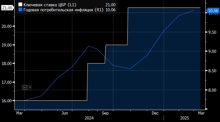 ЦБ РФ, скорее всего, оставит ставку на уровне 21% в марте 2025г - инвестбанк "Синара" Банк России, скорее всего, оставит ключевую ставку на уровне 21% годовых по итогам заседания в пятницу, 21 марта 2025 года, считает главный экономист инвестиционного банка "Синара" Сергей Коныгин. Вместе с тем, полагает эксперт, регулятор смягчит, вероятно, сигнал рынкам, что стало бы благоприятным фактором для ОФЗ с фиксированной ставкой купона. Снижение ставки, по мнению Коныгина, начнется не раньше 3К25. "Условия для смягчения денежно-кредитной политики еще не сформировались, - пишет аналитик инвестбанка в обзоре. - С очисткой от сезонности и в пересчете на год (SAAR) инфляция в феврале уменьшилась примерно до 8% против январских 11%, тогда как снижать ставку Банк России начнет, как мы полагаем, когда показатель опустится ближе к 5%. Маловероятно, на наш взгляд, что это случится на меньшем, чем трехмесячном горизонте. Более того, учитывая волатильность данных, регулятору необходимо удостовериться,