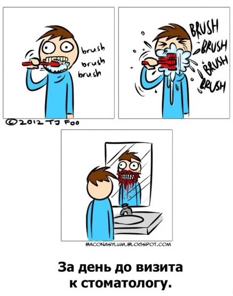 Мне попалось очень много комиксов из разряда "узнаём себя". Зарубежные авторы в основном описывают ситуацию, когда пациентам стыдно честно ответить на постоянный вопрос стоматологов об использовании зубной нити. Мне кажется, для нас это не так актуально, или мне просто не попадались такие врачи. А вот в зарисовке от BaconAsylum я точно себя узнал, а вы? В комиксах российских авторов гораздо больше преобладает другая линия. В основе стоимость стоматологических услуг. По этой теме и пройдёмс