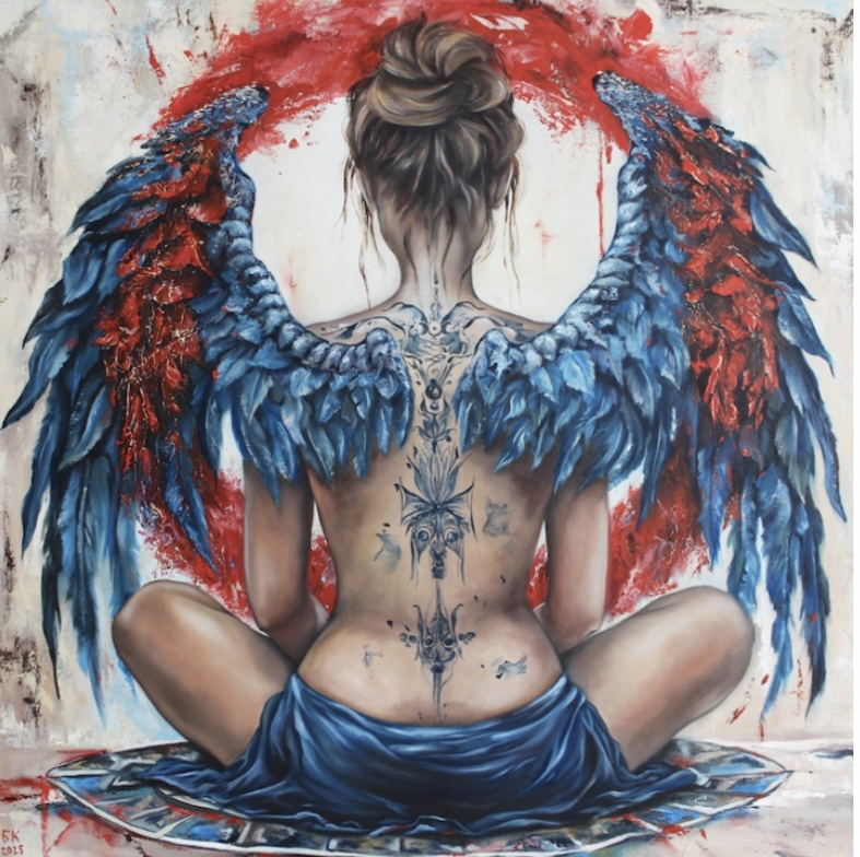 В полотне «Круг сансары», написанном маслом на холсте в 2025 году, Екатерина Быстрова создает глубоко символическое произведение, которое буквально затягивает зрителя в мир духовных исканий и трансформаций. Композиция выстроена вокруг центральной фигуры, изображенной со спины в медитативной позе. Художница мастерски использует пространство холста, помещая фигуру в центр и окружая ее элементами, расходящимися подобно волнам энергии. Ключевым элементом композиции становятся величественные крылья в синих и красных тонах, охватывающиефигуру с обеих сторон, создавая визуальный баланс и симметрию. Взгляд зрителя притягивается к исполненным мастихином красочным всплескам фона и крыльям и спине с татуировкой, а затем начинает исследовать более тонкие детали — узоры на коже, карты Таро разложенные по кругу, на которых сидит героиня. Интересно, что лицо героини скрыто от зрителя, что заставляет нас фокусироваться на языке тела исимволических элементах, основанных на мистическом значении ка