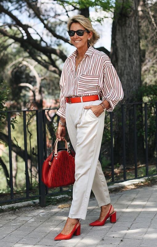 Если вы предпочитаете брюки, то для создания модного лука для женщин за 50 обратите внимание на изделия белого цвета. Разбавить их обманчивую простоту поможет интересная рубашка, блузка или топ. Наиболее подходящий аксессуар - шейный платок.