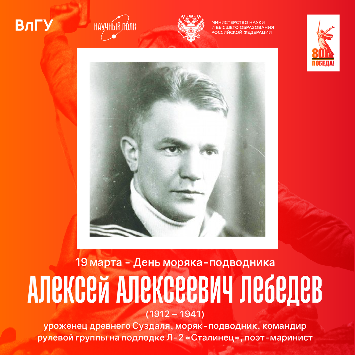 19 марта, в День моряка‑подводника, мы вспоминаем уроженца древнего Суздаля, командира рулевой группы на подлодке Л-2 «Сталинец», геройски погибшего в начале Великой Отечественной войны. Трудом и боем проверяют душу, Не отступив, пройди моря и сушу И уцелей в горниле грозном их, Чтобы себя и мужество решений Проверить сталью и огнем сражений. И в этом право на строку и стих. Эти суровые строки написаны Алексеем Лебедевым (1912-1941) – моряком-подводником, поэтом-маринистом. Уроженец древнего Суздаля (Владимирская область), расположенного посреди равнины, сын адвоката и учительницы, он с детства грезил морем. Частые переезды семьи из города в город, из губернии в губернию не приближали его к мечте, но она не отступала. После окончания школы Алексей уехал на Север, служил юнгой и матросом, но через три года по просьбе отца вернулся в Иваново, где тогда жила семья, и поступил в индустриальный техникум. Учёба там ему не нравилась, и призыв на срочную службу стал для юноши спасением. Он