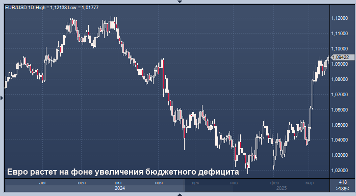 Евро достиг 5-месячного пика перед голосованием по пакету стимулов в Германии. На этой неделе заседания центральных банков будут посвящены перспективам. Иена падает перед решением Банка Японии График евро/доллара интервалами в 1 день Во вторник курс евро достиг наивысшего уровня за более чем пять месяцев по отношению к доллару США. Это произошло после того, как парламент Германии должен был проголосовать за значительное увеличение заимствований, которое могло бы стимулировать рост крупнейшей экономики еврозоны и региона в целом. В то же время курс доллара достиг двухнедельного максимума по отношению к иене. Инвесторы ожидают результатов политических заседаний Федеральной резервной системы и Банка Японии, которые состоятся в среду. Рынок также будет внимательно следить за развитием ситуации вокруг возможного мирного соглашения между Россией и Украиной. Это соглашение может оказать положительное влияние на курс единой валюты, поскольку президент США Дональд Трамп заявил, что планирует об