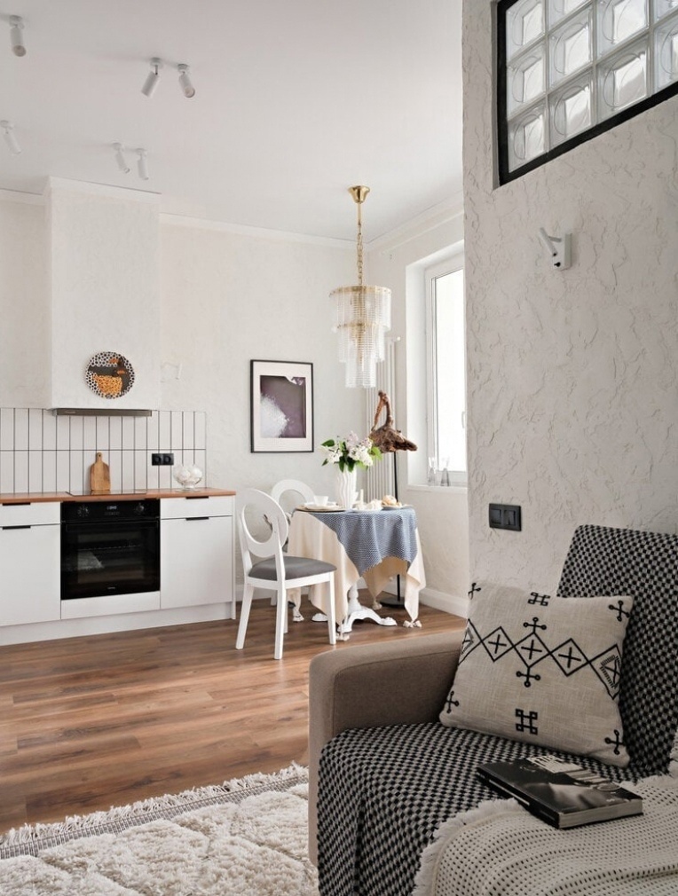 Данный проект прекрасный пример, как можно скорректировать небольшое пространство и разместить в нем различные функциональные зоны. Убрали перегородку между кухней и жилой комнатой, на площади жилой комнаты выделили небольшую приватную спальню и гостиную, обеспечив проникновение света сквозь техническое окно из стеклоблоков. Получили единое пространство кухни-гостиной и приватную комнату. Утепленная лоджия, примыкающая к кухне - дополнительное место для отдыха. Такая планировка идеальна для посуточной аренды; для проживания одного человека или пары. Для постоянного проживания необходимо бОльшее количество мест хранения. Подобная перепланировка возможна только в том случае, если межкомнатные стены не несущие. Мокрые зоны остались на своих местах.