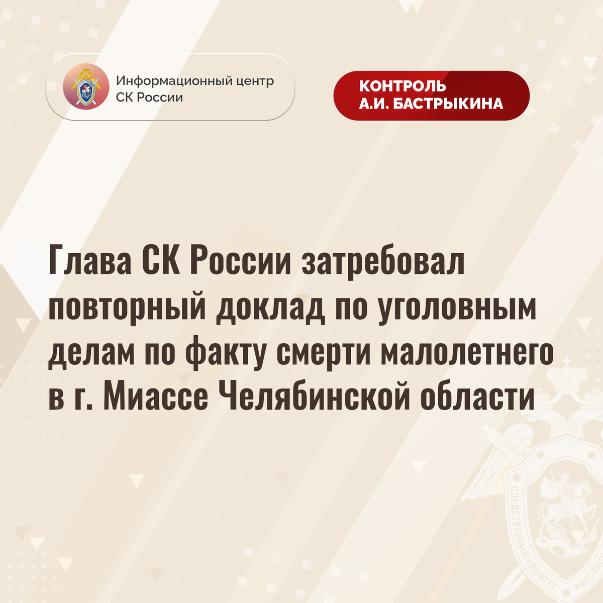 Глава СК России затребовал повторный доклад по уголовным делам по факту смерти малолетнего в г. Миассе Челябинской области