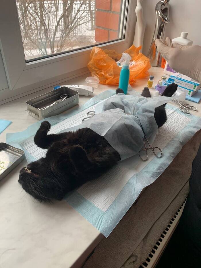 Ну если с Алёнкой ситуация была хотя бы более-менее предсказуема (хотя мы всё-таки не ожидали, что там всё настолько плохо), то Маркиза нас удивила. Ведь Маркиза якобы попалась случайно. Ловить её именно в этот раз никто не планировал. Шли целенаправленно именно за Алёнкой, срочно нуждающейся в помощи. Однако операция показала, что Маркизе так же грозила смерть от перитонита, т. к. её матка также была заполнена гноем. Конечно гноя было значительно меньше, чем у Алёнки, но он был. Маркиза видимо очень сильно хотела, чтобы ей помогли. Её пока вообще не планировалось ловить, нужно было помочь Алёнке. Поэтому чтобы она не мешала ловить Алёнку, её очень хорошо накормили. Но она всё равно продолжала крутиться вокруг котоловки. В итоге решили, что если она зайдёт и котоловка за ней захлопнется, значит это судьба. А ей и правда оказывается очень надо было, что она даже полезла вне очереди, типа "и меня тоже полечите". Уже не первый раз, когда настойчиво пытается пойматься кто-то другой, не зап