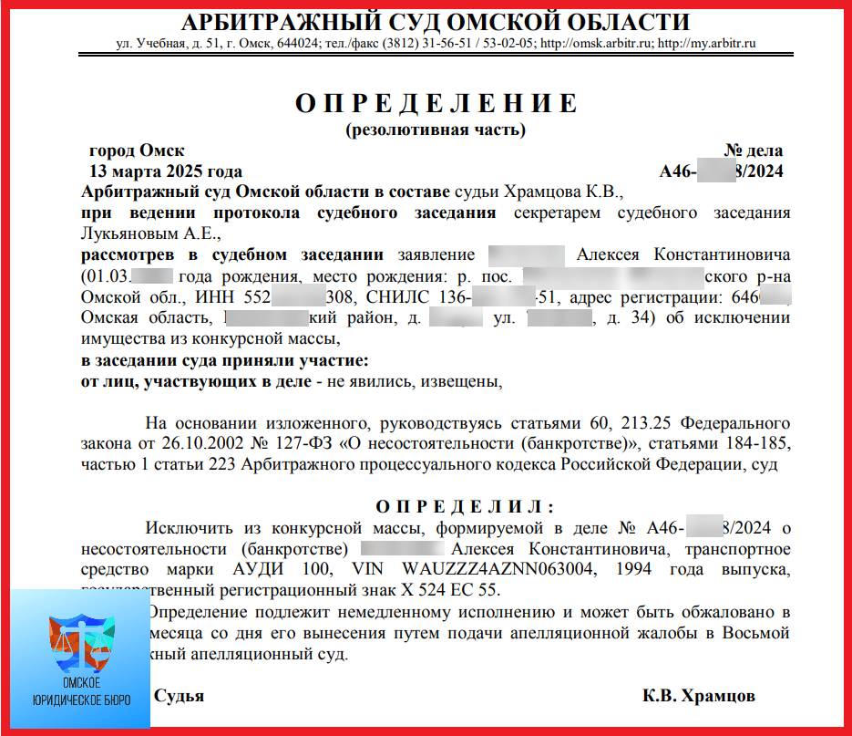 Процедура банкротства по нашему клиенту Алексею Константиновичу еще не завершена, но мы уже успели порадовать клиента. Сейчас расскажем, как именно Как известно, крупное имущество должника в процессе банкротства изымается для погашения долга. К такому имуществу относятся, например, транспортные средства. У Алексея Константиновича был автомобиль и он очень не хотел терять его. Наши юристы добились того, чтобы автомобиль не покинул своего владельца. Специалисты аргументированно доказали в суде, что автомобиль является жизненно важным имуществом: клиент живет в области, у него дети-инвалиды школьного возраста и их нужно развозить по больницам, школам, секциям и т.п. Суд встал на сторону должника в этом вопросе. И еще одно важное уточнение: операция по спасению автомобиля была проведена нами в рамках действующего договора по банкротству, мы не стали брать дополнительные деньги по новому вопросу. А в других организациях за дополнительную работу взяли бы дополнительную плату. И немалую! В до