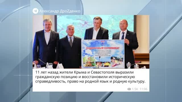 Александр Дрозденко поделился в своем телеграм-канале уникальными историческими фотографиями. Губернатор Ленобласти Александр Дрозденко поделился в своем телеграм-канале уникальными уже, можно сказать, историческими фотографиями 2014 года. На них — представители Крыма и Ленинградской области, а также подарочный сертификат на детские площадки. Тогда наш регион подарил Симферопольскому району 22 комплекта игрового оборудования. 11 лет назад жители Крыма и Севастополя выразили гражданскую позицию и восстановили историческую справедливость, право на родной язык и родную культуру. Крымская весна стала одним из первых шагов в формировании многополярного мира и предвестником серьезных геополитических изменений.