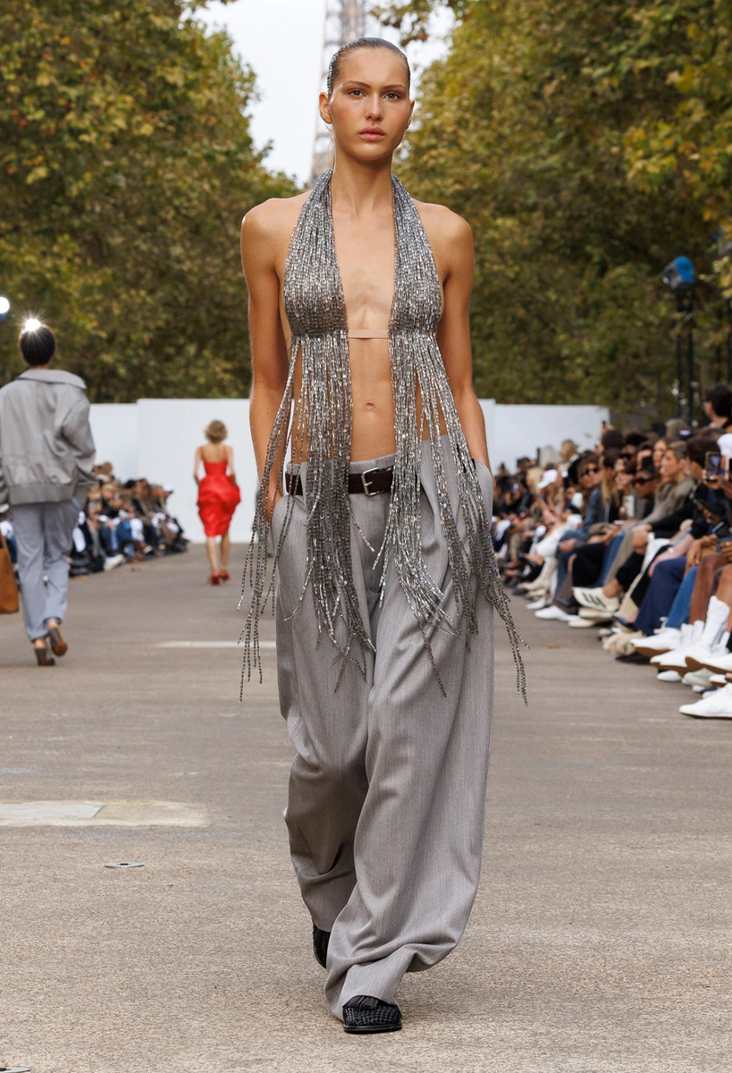 В коллекции Весна-Лето 2025 Стелла вновь подтверждает свою репутацию амбассадора этичной моды. Никакой кожи, меха, перьев и прочих материалов животного происхождения❌ А некоторые вечерние наряды были созданы из переработанного пластика от крышечек. Так что если вы сортируете мусор, кто знает, может, в этой коллекции есть и ваш вклад❓😉 Но коллекция интересна не только своим экологическим месседжем. Она также радует глаз и вдохновляет интересными идеями и модными трендами. Здесь сразу бросается в глаза уже знакомое сочетание женственности и маскулинности. Воздушные платья из струящихся материалов с эффектными разрезами и драпировками соседствуют с пиджаками с широкими плечами Что-то подобное мы уже видели в коллекциях других дизайнеров, и похоже, этот тренд с нами всерьез и надолго. Так что берем на заметку и начинаем думать, как лучше вписать эти смелые идеи в свой гардероб. Даже если кажется, что это точно не ваше, всегда можно найти вариант, который и в тренды попадет, и вашему собс