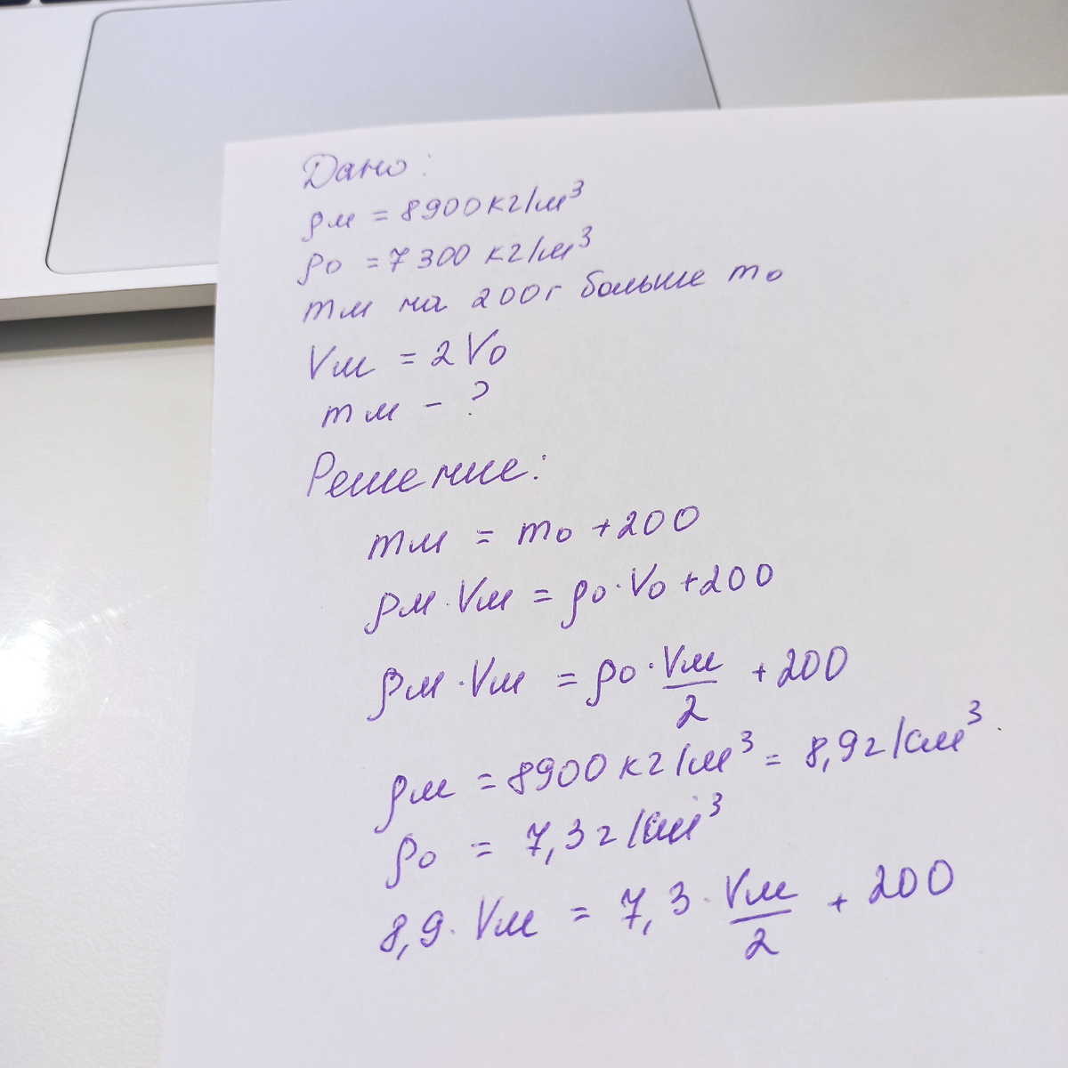 Объём медного бруска в два раза больше объёма оловянного бруска, а масса медного бруска на 200 г больше массы оловянного бруска. Определите массу медного бруска, если плотность меди 𝜌м=8900 кг/м3 , а плотность олова 𝜌о=7300 кг/м3. Ответ дайте в кг, округлив до сотых.