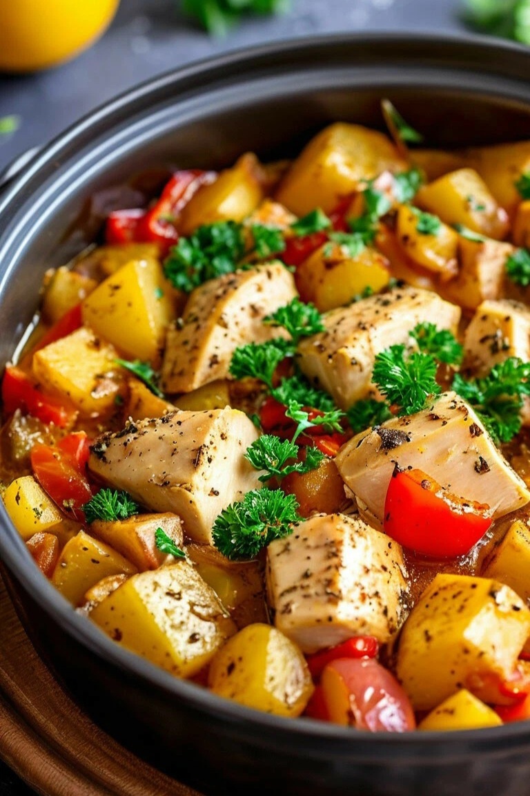 Тушеная курица с картошкой — это классическое блюдо, которое сочетает в себе простоту приготовления и насыщенный вкус. Нежное куриное мясо, пропитавшееся ароматами специй и овощей, в сочетании с мягким картофелем создаёт идеальное сочетание для сытного обеда или ужина. Это блюдо не требует сложных ингредиентов и может быть приготовлено всего за несколько шагов. В этой статье мы поделимся проверенным рецептом, который поможет вам быстро и легко создать вкусное угощение для себя и своих близких. - Картофель очистите и нарежьте крупным кубиком (примерно 3х3 см). - Куриное мясо, лук и болгарский перец нарежьте аналогично. - Зелень и чеснок мелко нарежьте. - В кастрюле или небольшом казане разогрейте растительное масло на сильном огне. - Добавьте лук и обжаривайте до золотистой корочки. - Затем добавьте куриную грудку и слегка обжарьте, посыпьте приправой для курицы. - Добавьте болгарский перец, перемешайте и готовьте до полуготовности. - Засыпьте картофель и залейте водой так, чтобы о