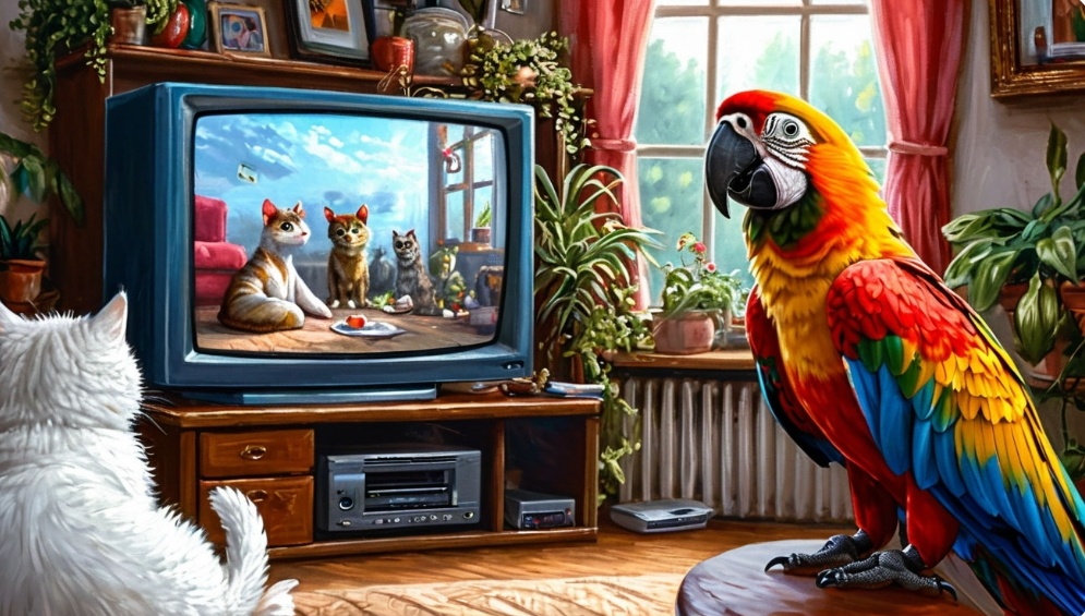 Продолжение. Предыдущие рассказы смотрите ЗДЕСЬ Прррривет! Сегодня у нас культурная программа. Хозяева включили мультики! Сидят, улыбаются, а я, Кекс Великолепный, тут же подключился. Ну, а что? Я же интеллектуал. И вдруг — о чудо! — показывают какого-то попугая. Рябого, крикливого. В тельняшке. И в шляпе. Имя — Кеша. Ну, Кеша и Кеша, а я-то думал, хоть «Великолепный» в титрах напишут. Ан нет. Зато он орет: «Таити, Таити! Нас и тут неплохо кормят!» Ну, да, конечно. Кормят. Ага, семечками. И зернышками. Как будто я не знаю, что на Таити кокосы и ананасы. Хозяева, вы слышите? Мне бы ананас, а не эту дешёвку! Наша кошка, Пушинка Обжоркина, конечно, тут как тут. Уселась перед телевизором, хвостом виляет, глаза округлила. — Мррр, — говорит, — а это что, учебное видео? Как правильно воровать еду? — Нет, Пушинка, — отвечаю я. — Это про нас, гениев, которых не оценили. — А почему он в шляпе? — не унимается кошка. — Потому что у него, в отличие от тебя, стиль есть! — парирую.