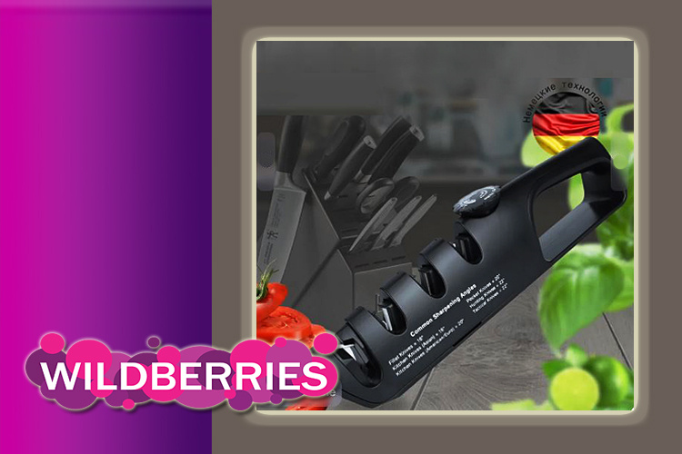 На ВБ можно найти различные точилки, но меня заинтересовала эта, поскольку подходит для всех типов ножей и ножниц, имеет трехступенчатую систему заточки, а также 6 положений, с помощью которых можно регулировать угол заточки.