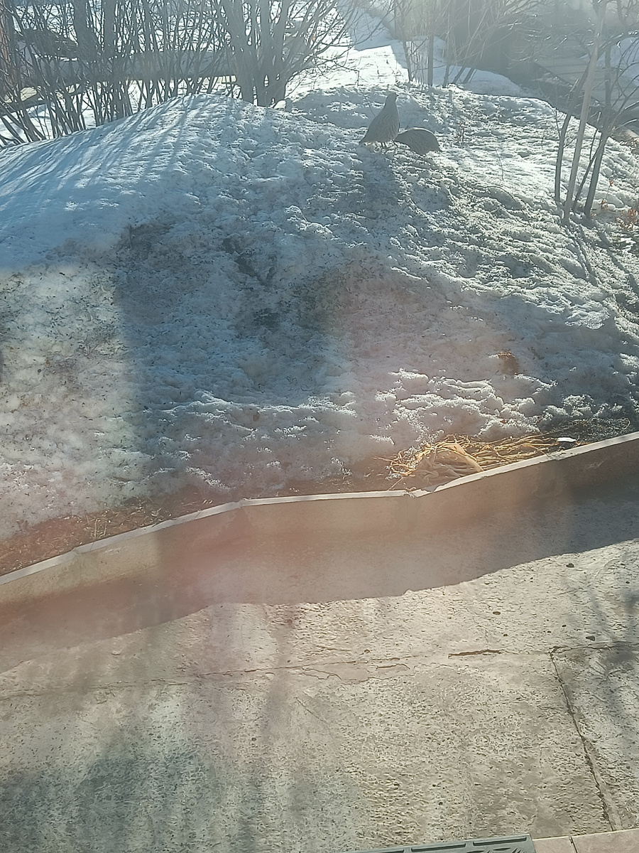 Поздно вечером возвращались домой в темноте. Проходя мимо газона под окнами вспугнули стаю куропаток, которые взлетели с таким шумом, что вспугнули нас, и удалились в ночь. А утром появилась забавная парочка, которая целый день делала котикам нервы, прогуливаясь прямо перед носами, измусолившими все окна. Один или одна ест, другой караулит. такие забавные. Котики устроили истерику, требуя выпустить их на охоту. А пернатые целый день издевались, глядя на закрытые окна и двери.
