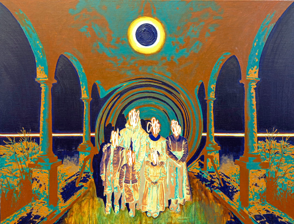 Из серии работ по мотивам пьесы "Король Лир» «Материал» - мистический семейный портрет, имитирующий фотографию. Цвета здесь искажены как на фотонегативе, а лица стёрты, будто кто-то «зачирикал» их шариковой ручкой. В центре композиции, за фигурами людей, мы видим огромную спиралевидную воронку: пространство вокруг искривляется и материальный мир обращается в ничто. Вот-вот эта воронка настигнет и людей, и они тоже пропадут без следа. Ключом к пониманию этой работы является само существование семейного фотопортрета. Всего несколько поколений спустя, мы часто не знаем имена тех, кто запечатлён на архивном фото. Именно этот процесс «стирания» коллективной памяти художник передаёт в своей работе. А цвета, напоминающие не только фотонегатив, но местами и цвета коррозии металла, усиливают метафору исторического забвения. Мотив пьесы «Король Лир» Шекспира можно уловить лишь отдалённо, через придворные наряды, не похожие на несо