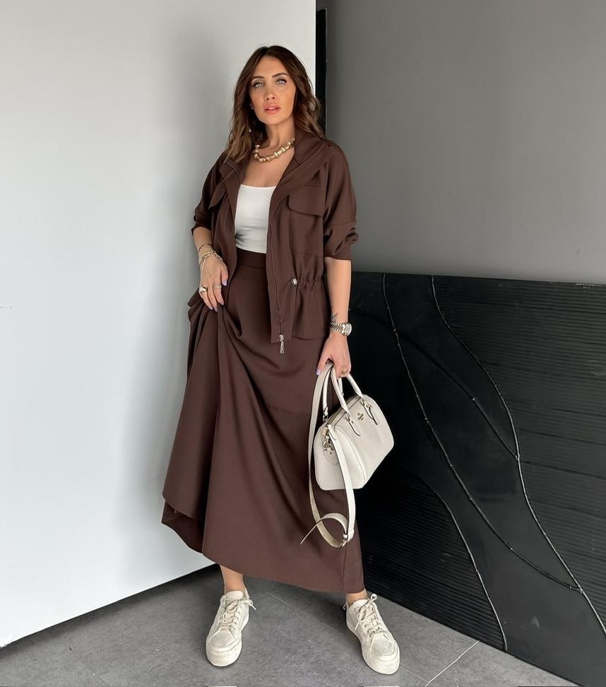 Casual стиль – идеальное решение для повседневных дней, когда комфорт сочетается с актуальными трендами. Весна 2024 диктует свои правила, предлагая нам множество интересных сочетаний и возможностей для самовыражения. Хотя, коричневый больше подходит для осеннего сезона, многие дизайнеры в своих коллекциях весна-лето 2025 сделали ставку именно на этот цвет. Так что смело выбирайте юбки, брюки или костюмы в шоколадном оттенке. Этот цвет хорошо комбинируется как нейтральными, так и с насыщенными оттенками. Нежный и женственный образ модница создала с помощью шелковой юбки-макси, розовой футболки и свободного жакета белого цвета. Нотку расслабленности добавили мини-сумка, белые кроссовки и платок. Белая рубашка легко вписывается как в деловой, так и в повседневный стиль. Чтобы создать максимум комфортный образ модница надела с рубашкой светло-оливковые прямые брюки и в тон к ним замшевые лоферы. Сумка пастельного оттенка гармонично вписалась в образ. Платье-рубашка - отличный вариант для