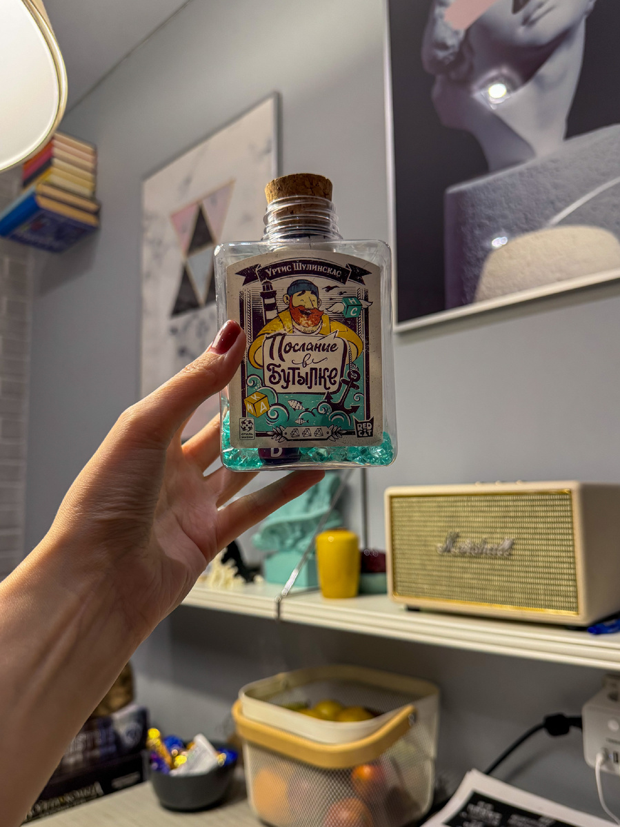 У меня дома лежит целый склад игр со словами — ничего не могу с собой поделать: всё, что находится на гуманитарной настольной стороне, стремительно оседает у меня на полках. Я даже искренне жалею, что лет 10 назад не взяла себе всё-таки буквенный «Руммикуб», поэтому ничего удивительного, что когда вышла игра «Послание в бутылке» и я заприметила внутри игры кубики с буквами, то сразу заинтересовалась. ПРАВИЛА В игре есть 5 кубиков, и три из них подходят для простого режима (детского), если вы добавите тёмно-синий куб — перейдёте в классический режим игры, а вместе с кубиком «эффектов» игра станет более неожиданной, разнообразной и сумасшедшей. Правила очень просты: встряхиваешь бутылку и придумываешь слово из выпавших букв. На тёмно-синем кубике более «сложные» буквы: ч, ш и так далее, поэтому партии с ним и рекомендуются для взрослых. Первым придумавший слово получает кристалл — победное очко. Игра ведётся до 8 кристаллов у одного игрока — он и становится победителем. ВПЕЧАТЛЕНИЯ Я сыг