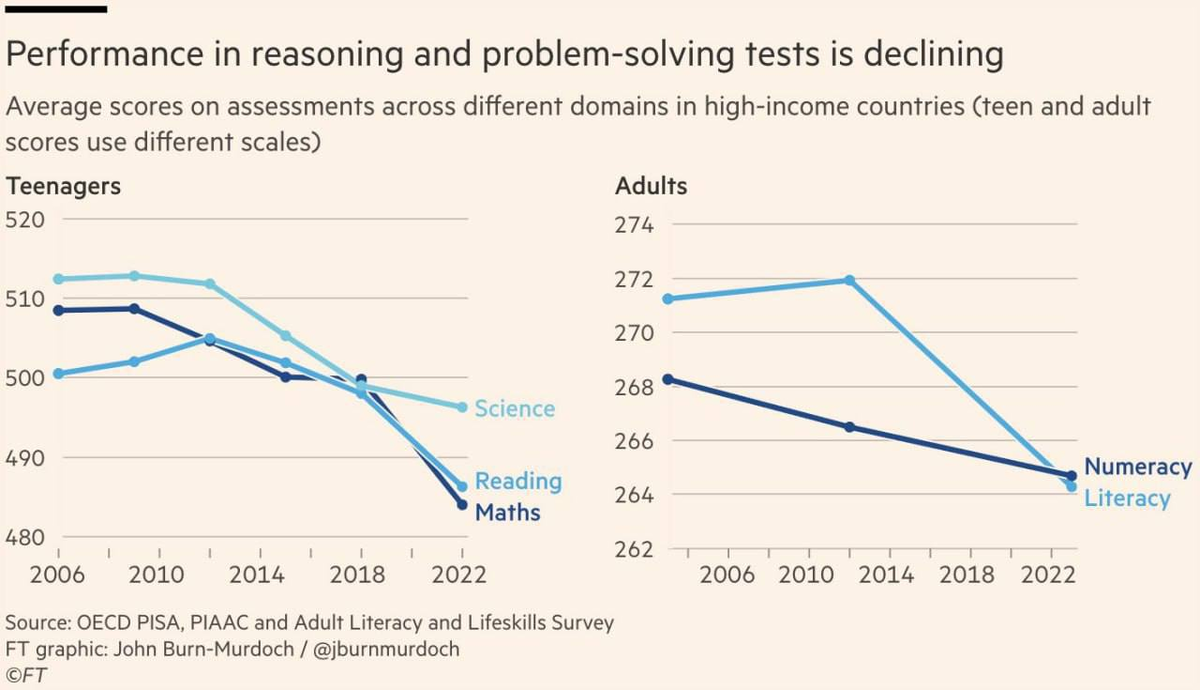 Статистические данные показывают, что с 2010 года люди хуже сосредотачиваются, слабее анализируют информацию и теряют логическое мышление ▫️ 25% взрослых в развитых странах не справляются с базовой математикой, в США – 35% ▫️ После 2015 года количество 18-летних с проблемами внимания резко возросло ▫️ В 2022 году чуть менее половины опрошенных не прочитали ни одной книги, а 45% подростков не читают вообще *** Вся новая интересная информация по геополитике и фондовом рынке, публикуется в нашем телеграмм-канале Один хороший трейд