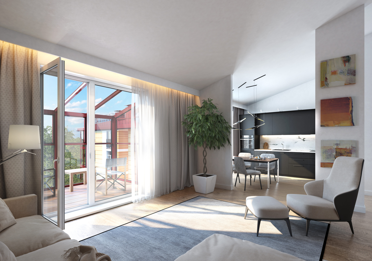 В минималистичных интерьерах часто отказываются от перегородки между кухней и гостиной, чтобы увеличить полезную площадь. Большой балкон воспринимается как продолжение квартиры. Удобная форма и большой размер балкона позволяет использовать его в качестве кабинета, мастерской, зимнего сада или спортивной зоны. В малоэтажных ЖК «Образцовые кварталы» представлены балконы с панорамным остеклением площадью от 6 кв м.